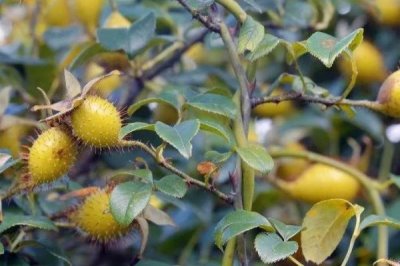 4、果梨形、倒卵形,稀近球形,紫褐色,外面密被刺毛,果梗长约3厘米,萼片宿存。花期4-6月,果期7-11月。